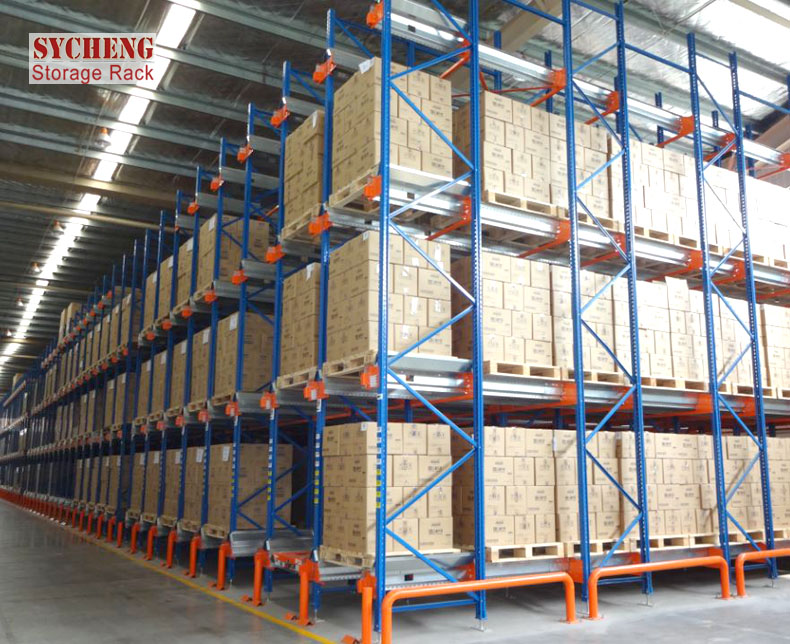 1.采用穿梭式貨架,可以根據倉庫尺寸,僅有1條叉式作業通道,順著物流的方向布置;